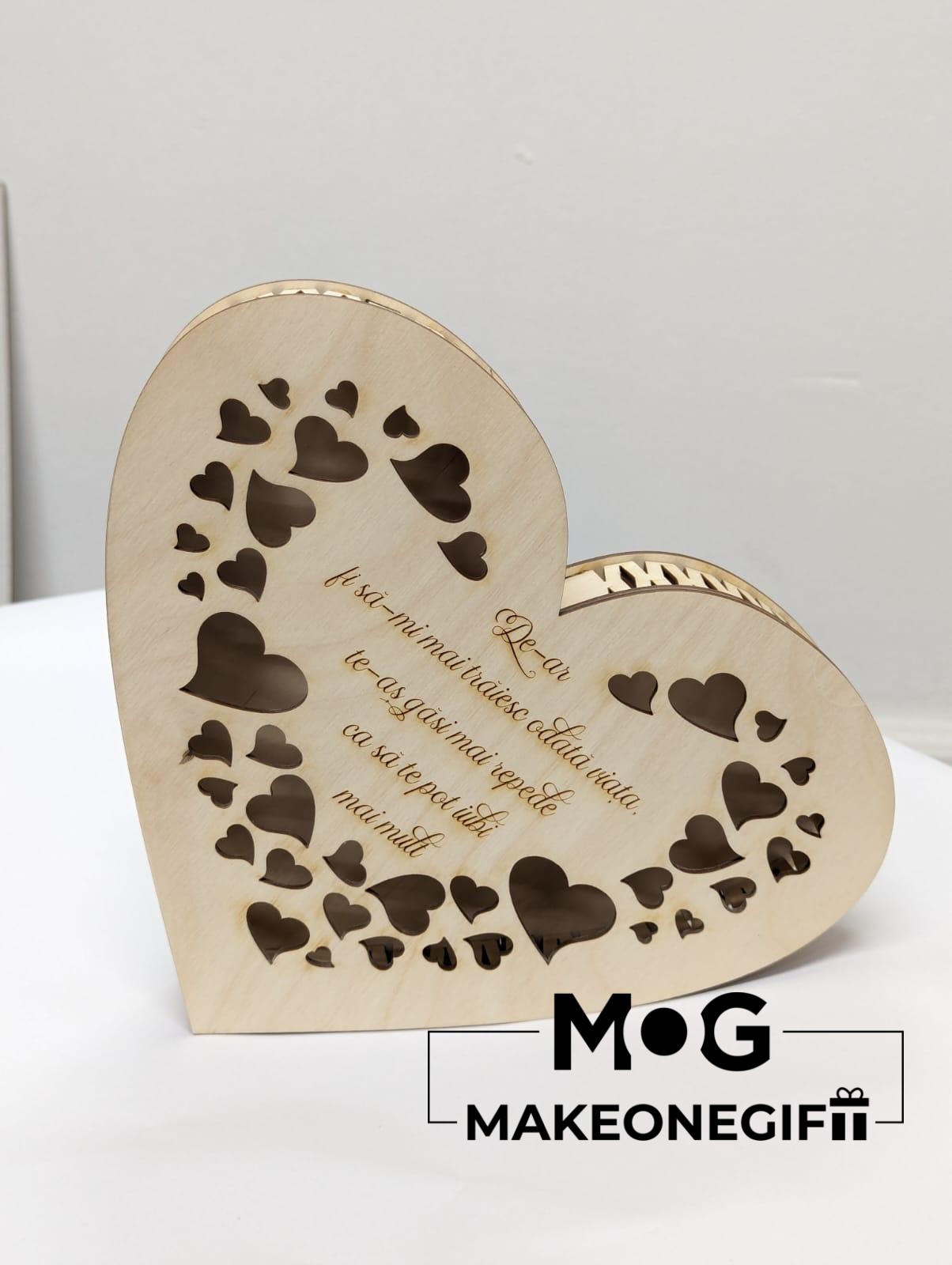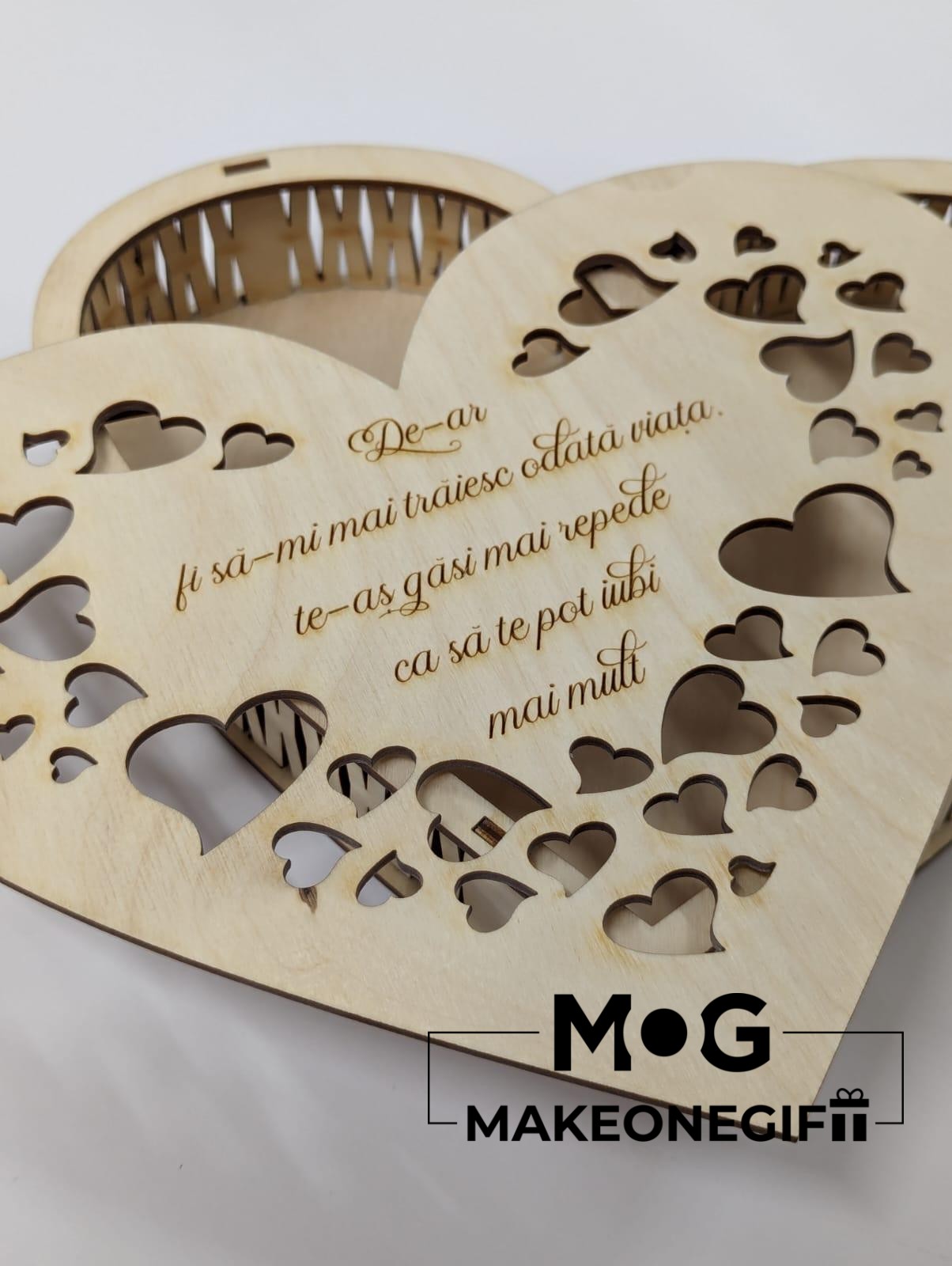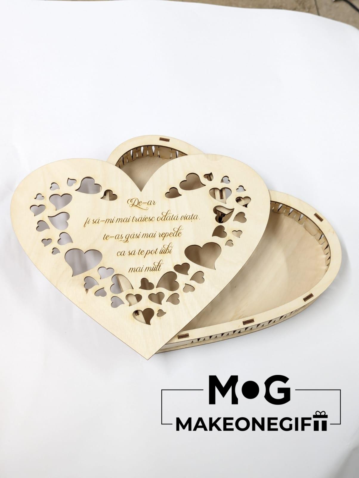Een decoratieve houten doos in hartvorm, met uitsnijdingen en een gegraveerde tekst, ideaal voor cadeaus of speciale herinneringen.