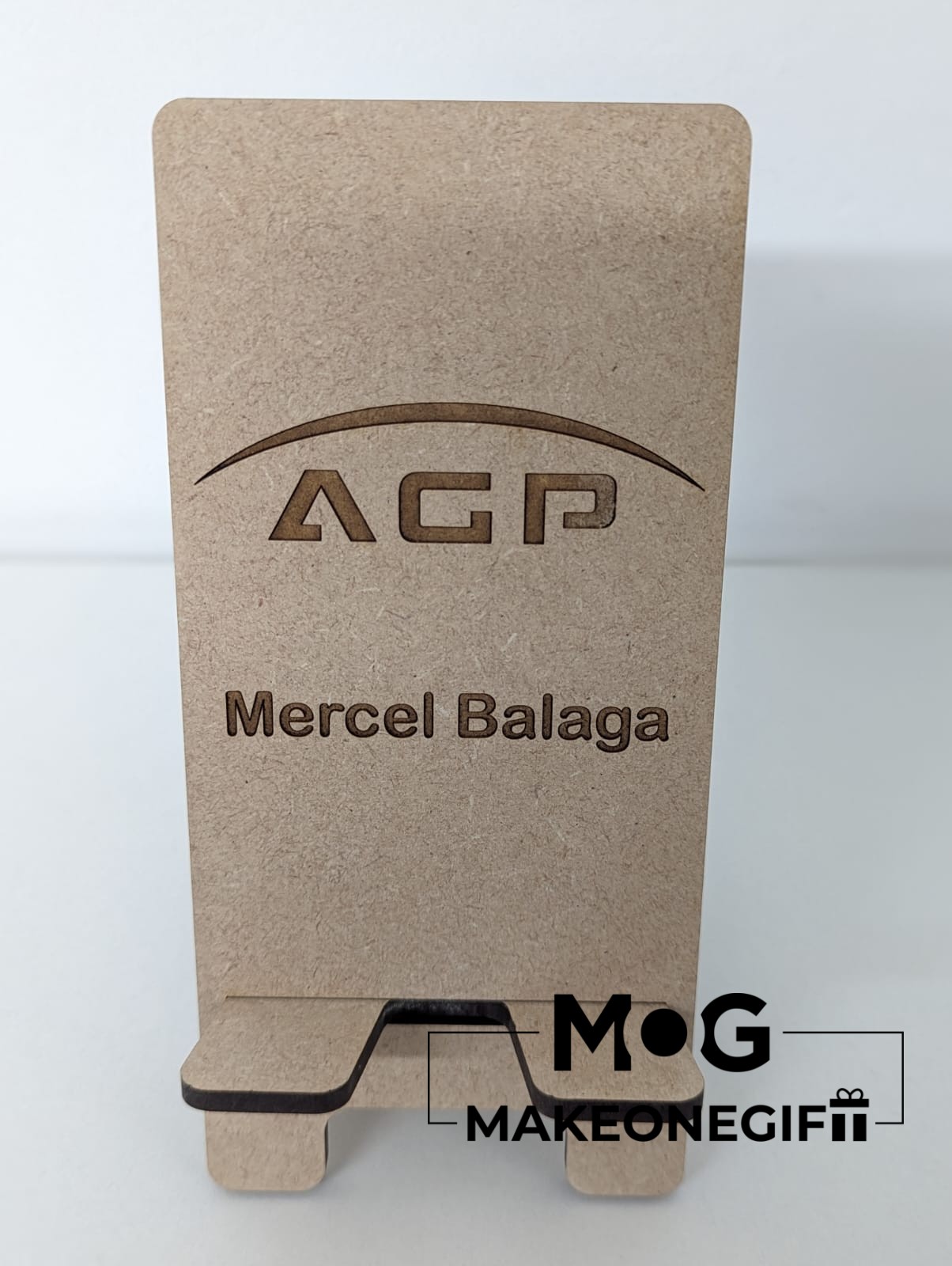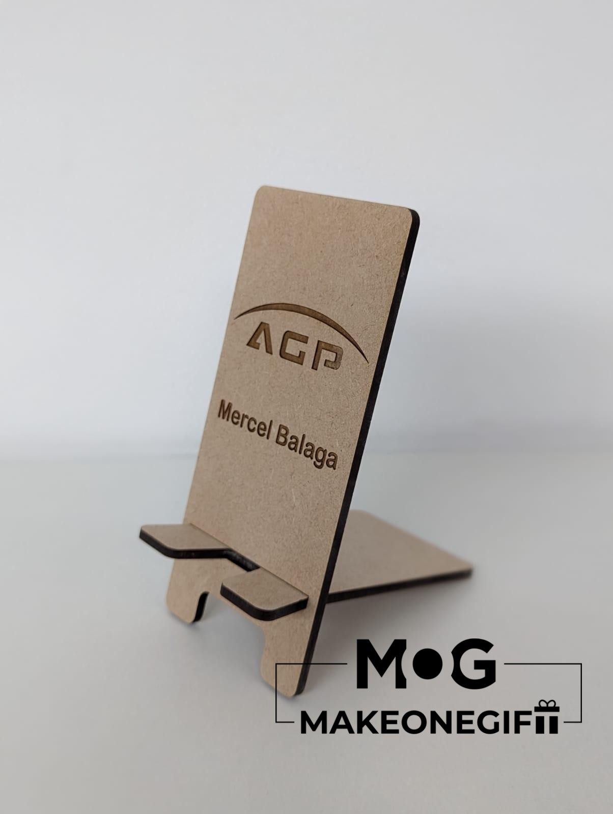 Aangepaste MDF telefoonhouder met naam, logo of tekst.